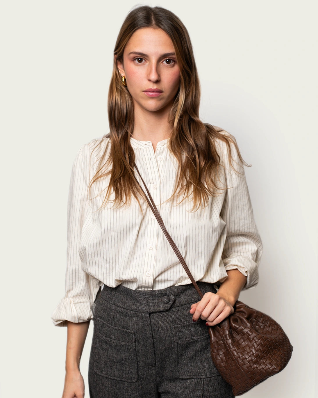 Bolso de piel trenzada color marrón chocolate en forma de saquito, de la marca Naterra.