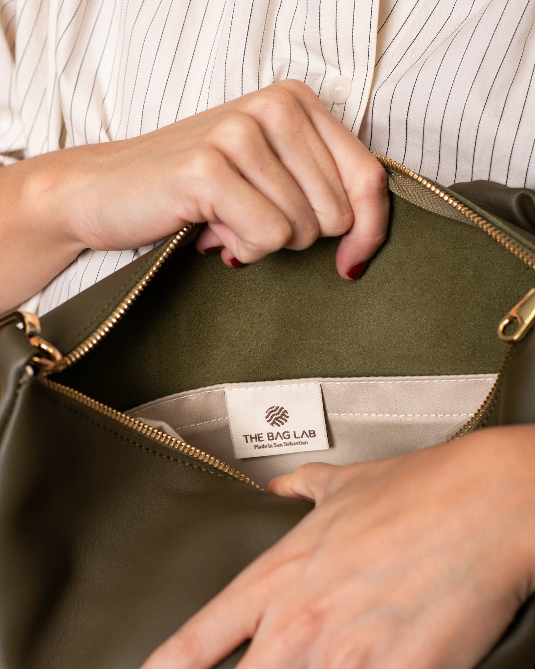 Bolso mediano de piel en forma de góndola, con asa corta, en color verde caqui, que se adapta a cualquier ocasión.