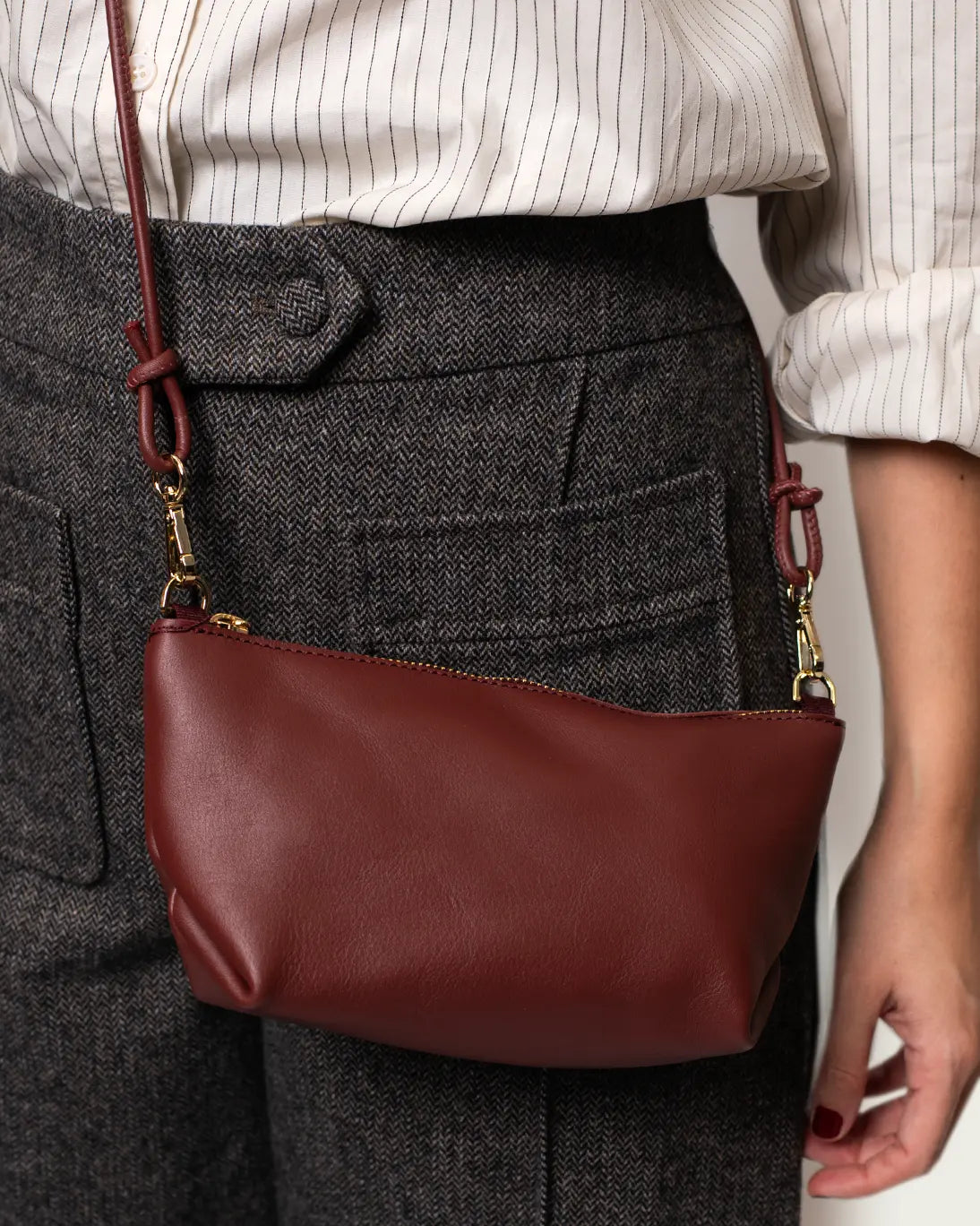 Bolso baguette realizado en piel vacuno en color burdeos con cierre de cremallera y asa de mano en piel con dos posiciones distintas.