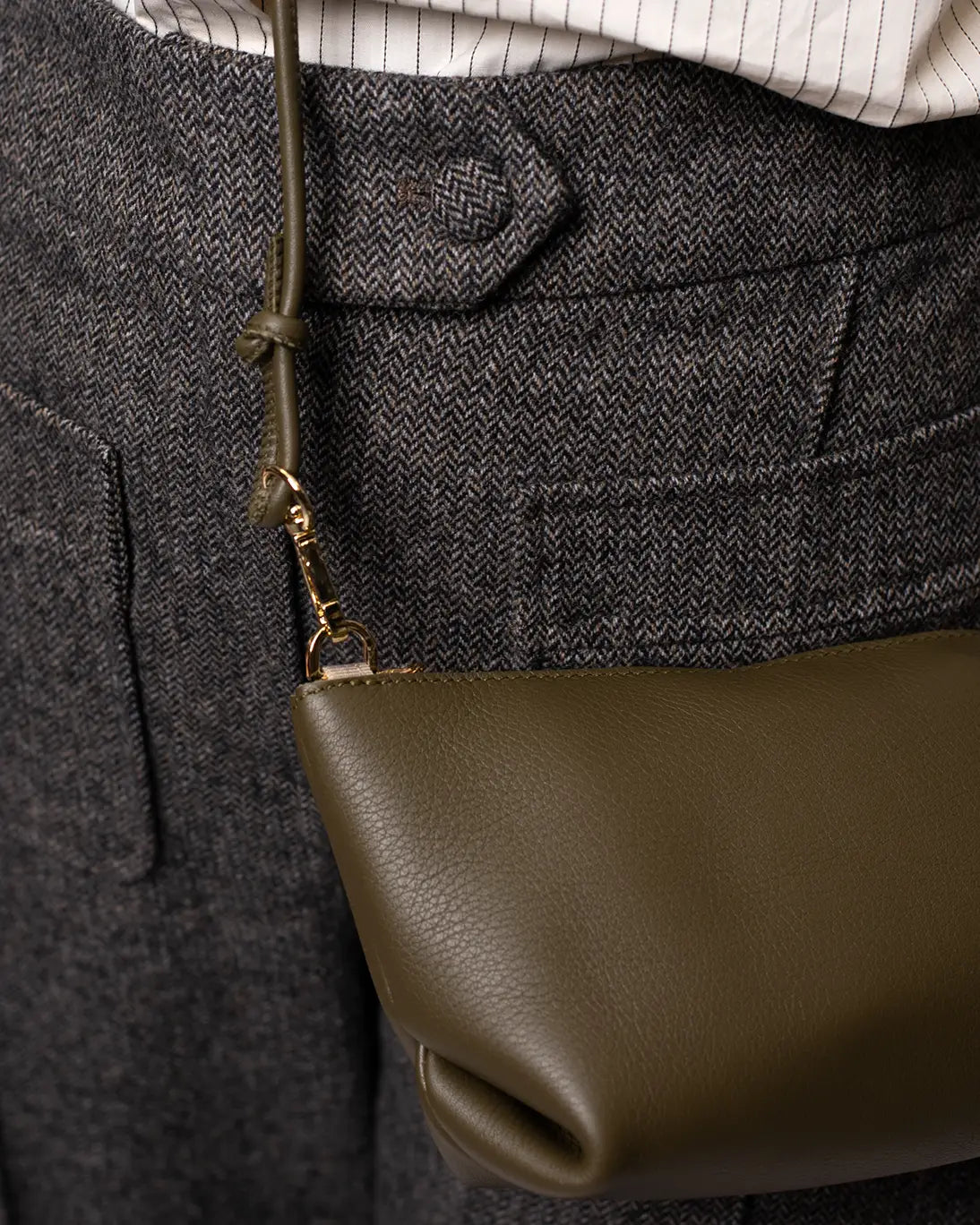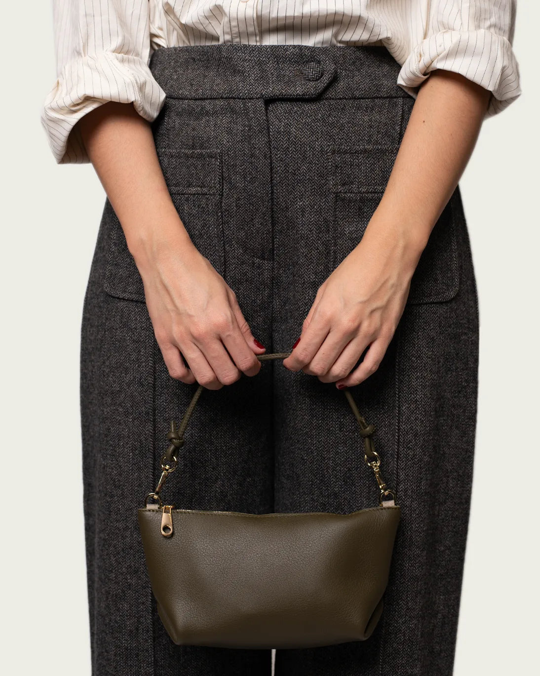 Bolso baguette realizado en piel vacuno en color caqui con cierre de cremallera y asa de mano en piel con dos posiciones distintas.