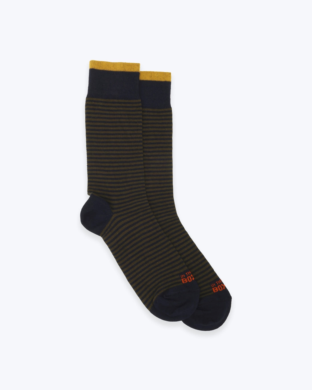Calcetines de rayas azules y verdes con ribete mostaza de la marca In The Box.