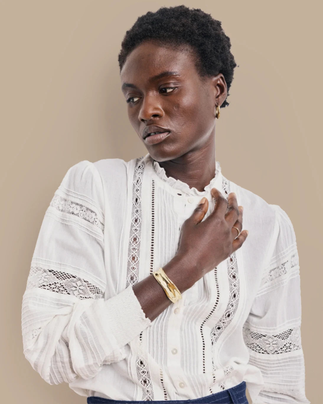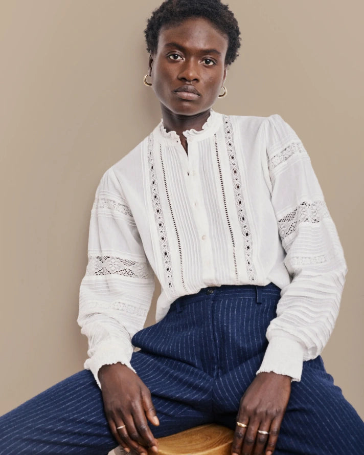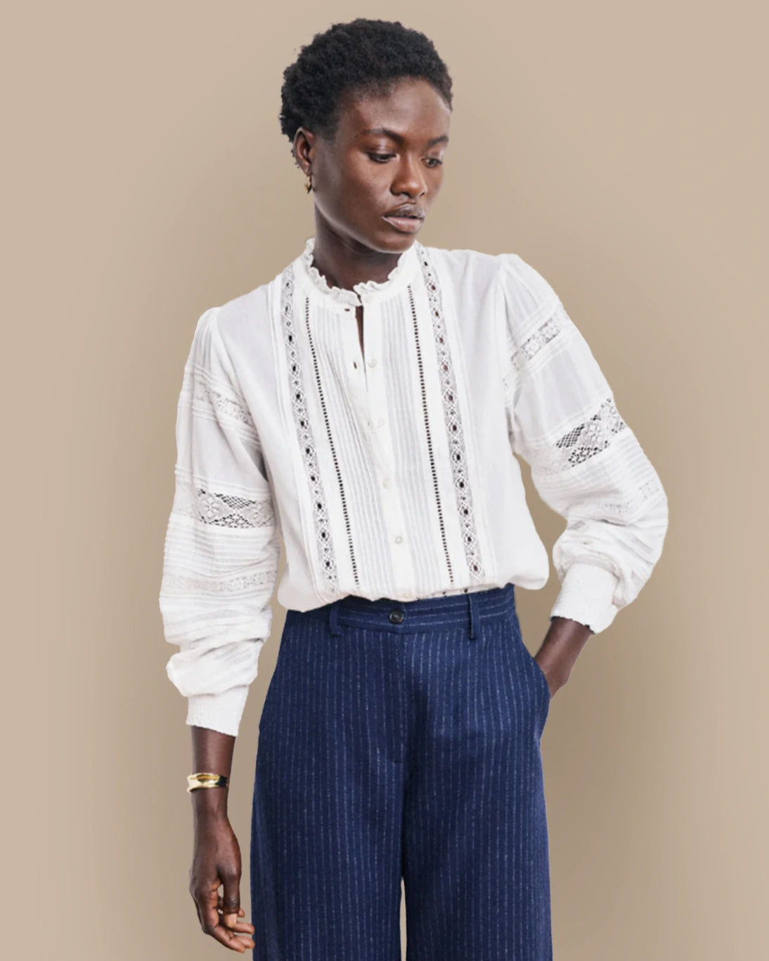 Camisa blanca de Hartford, con volante en el cuello y escote redondo.