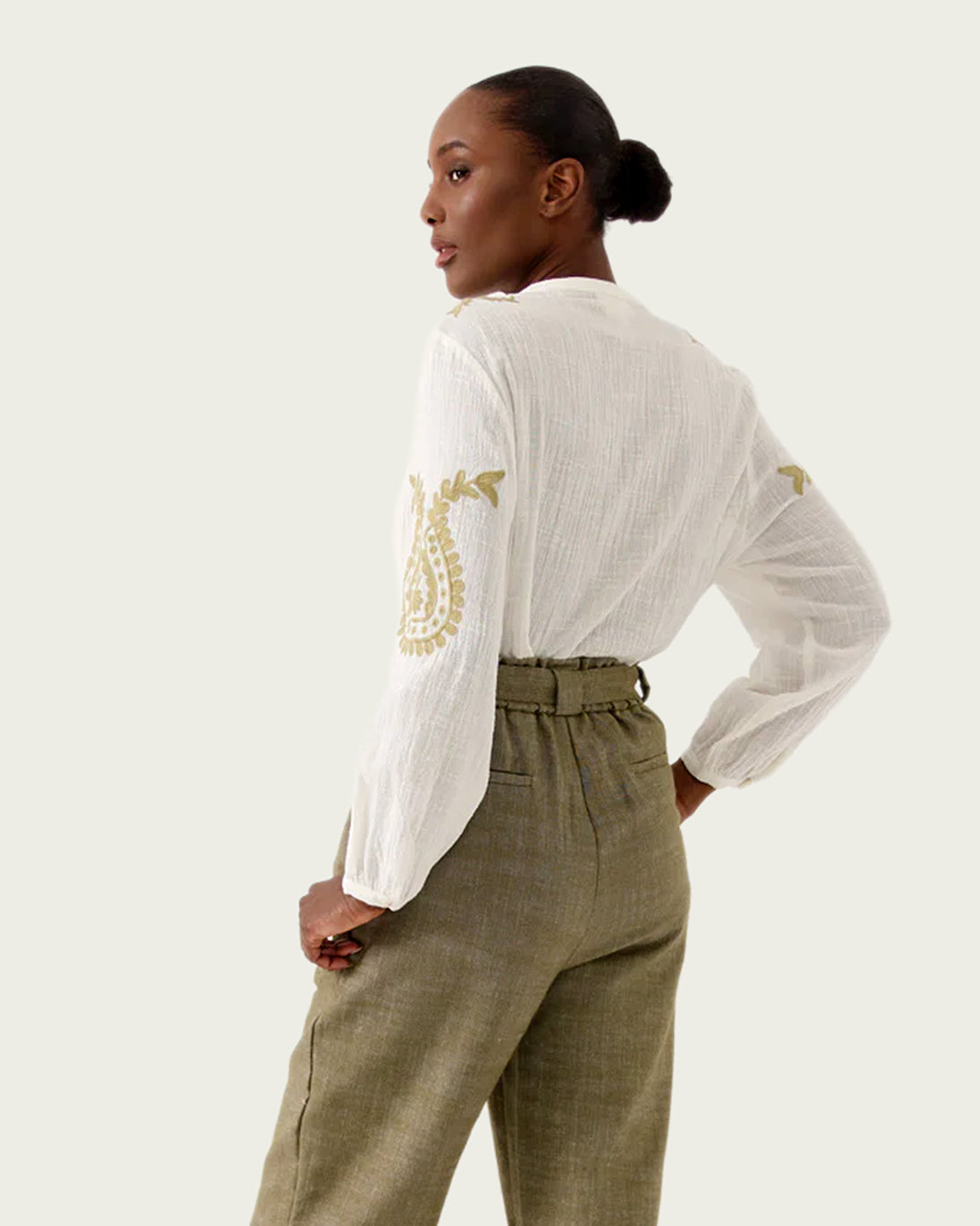 Camisa blanca con cuello mao y bordados de estilo indio en verde. Es de la colección de primavera de Artlove.