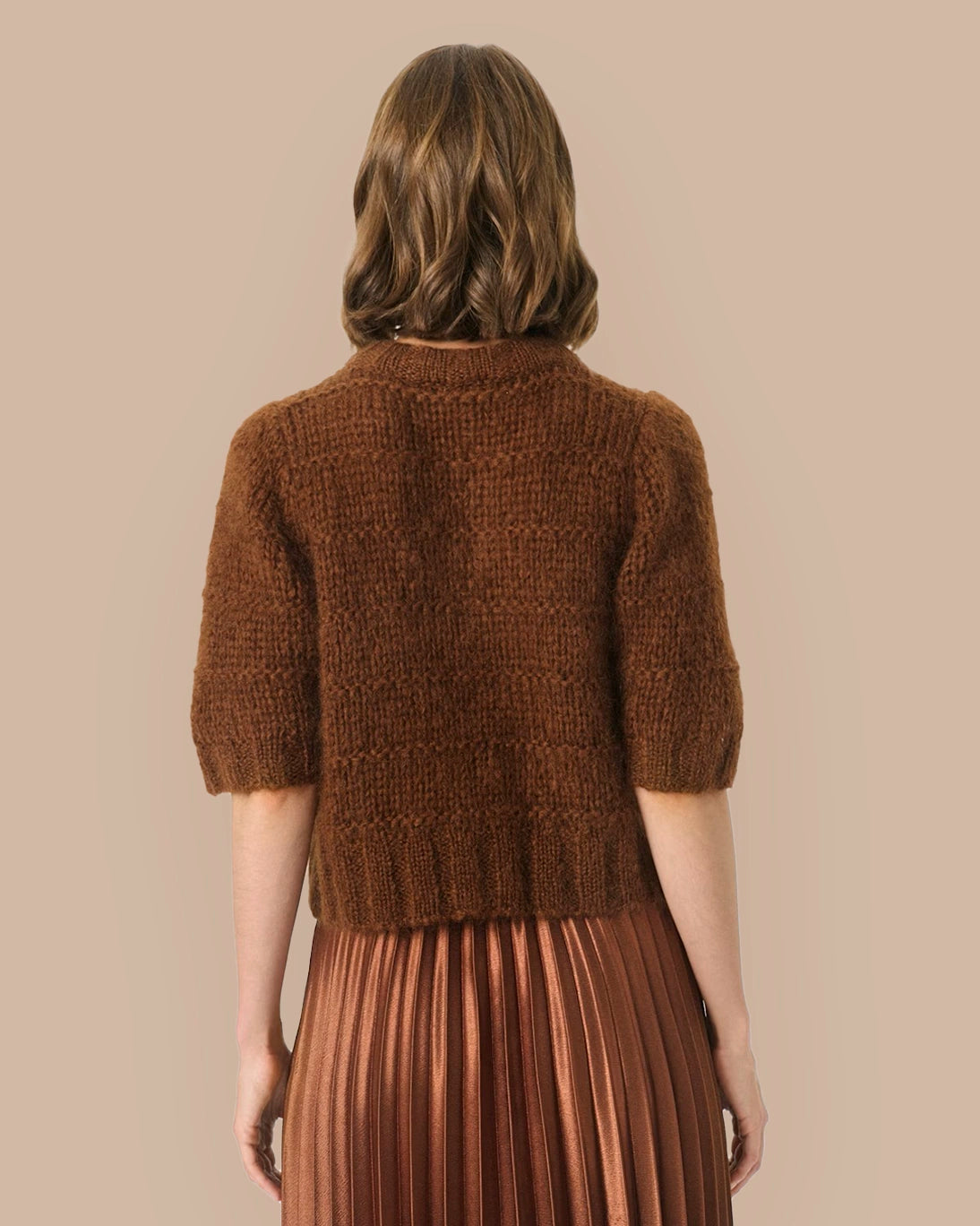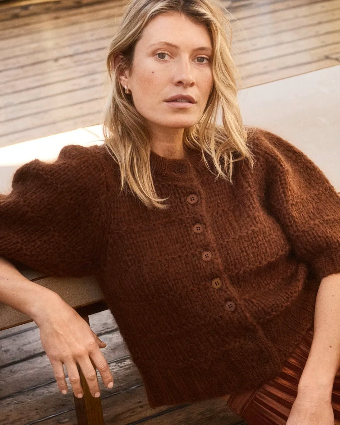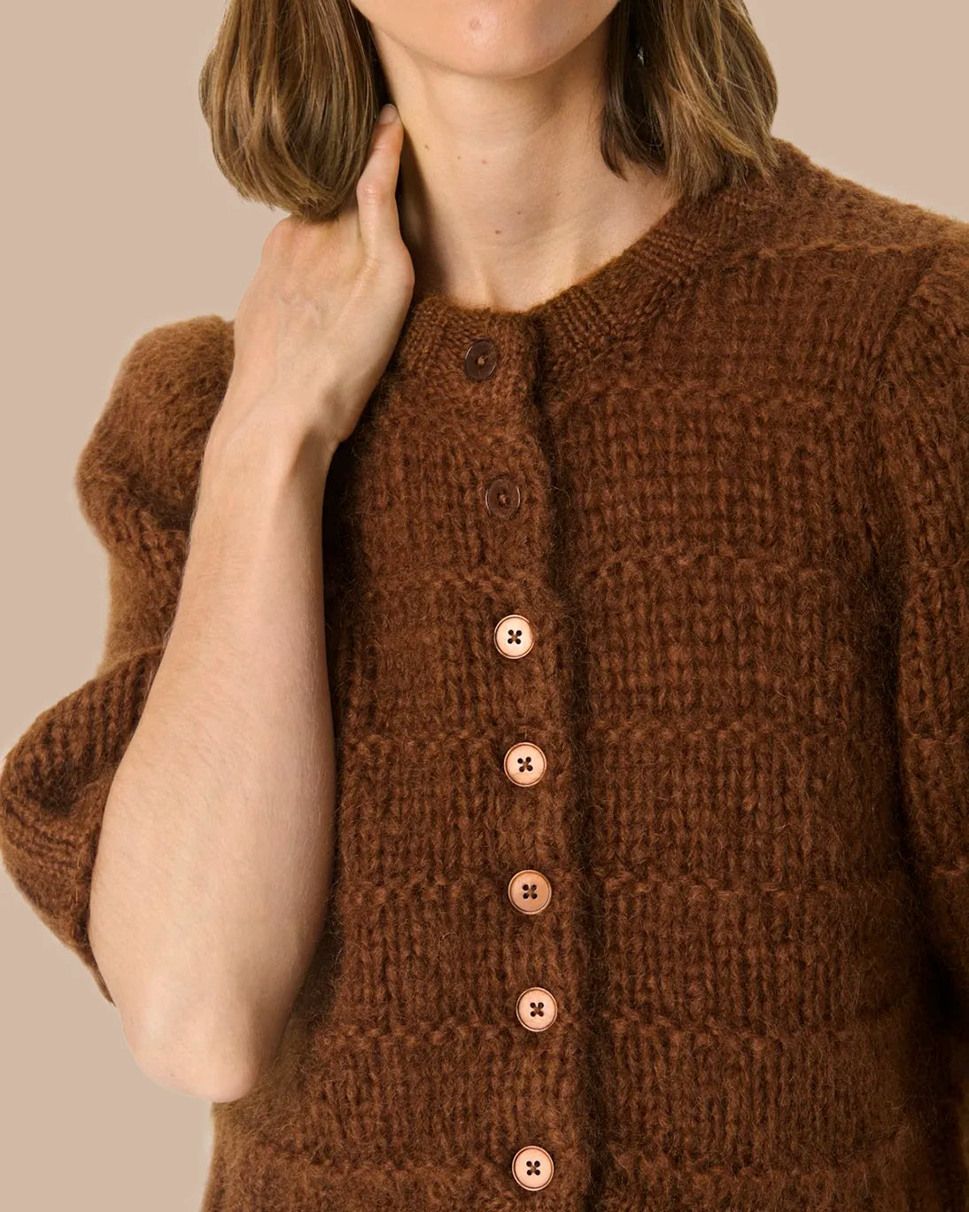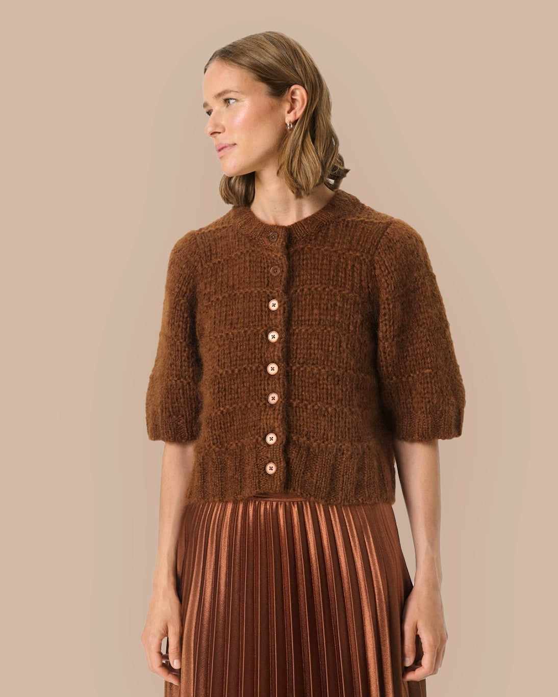 Cárdigan Vernona de la marca Part Two. De manga corta y textura esponjosa, en color marrón castaña destaca por sus botones frontales, que aportan un detalle sutil y femenino.