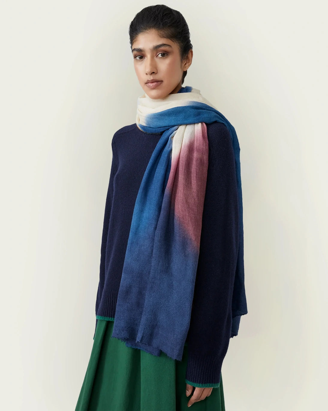 Chal 70x180cm de la marca Moismont. El estampado tiene formas geométricas limpias y su paleta tricolor cobran vida gracias a un teñido artesanal, que crea un sutil juego de tonos. Hecha de lana y seda, combina fluidez, ligereza y carácter.