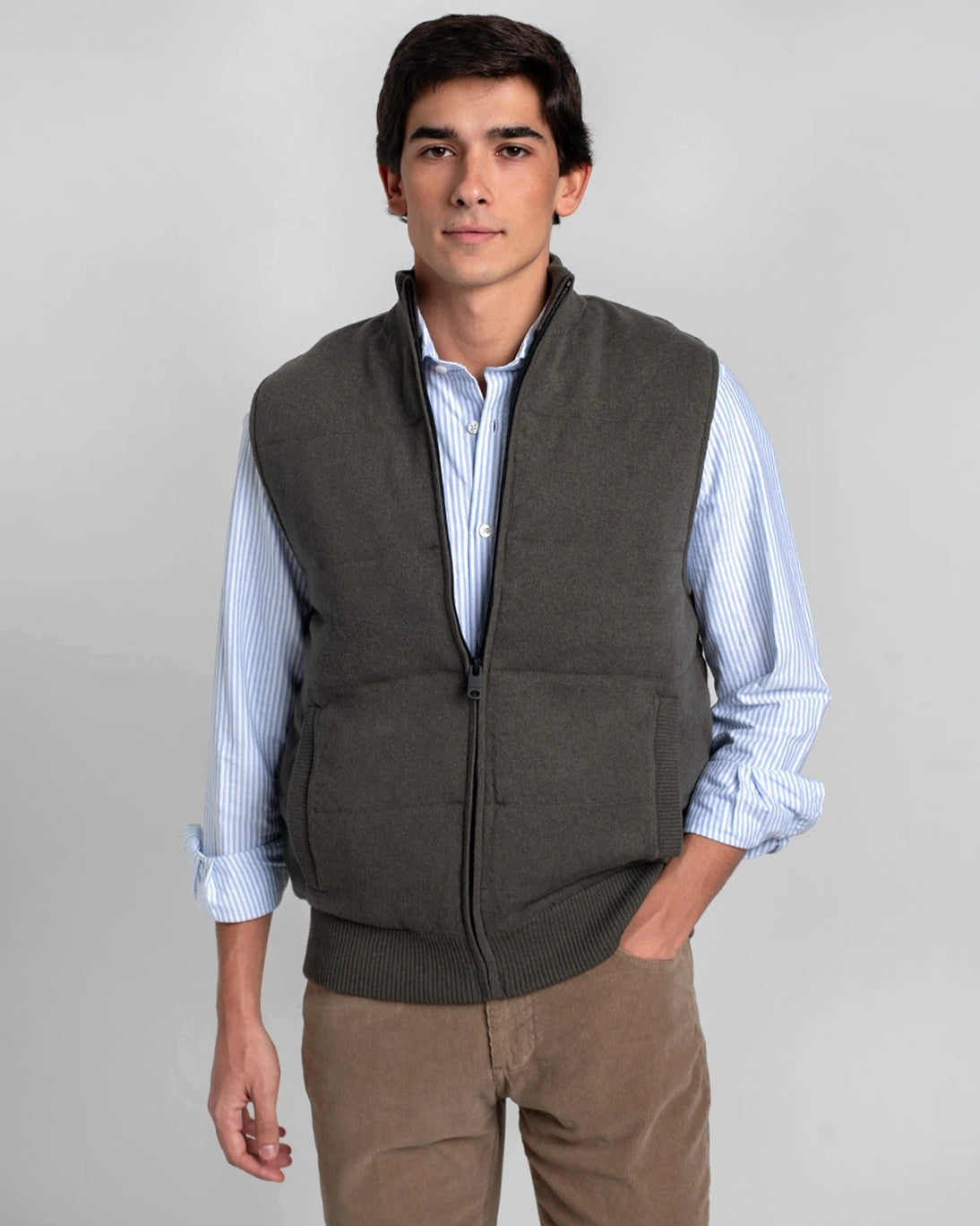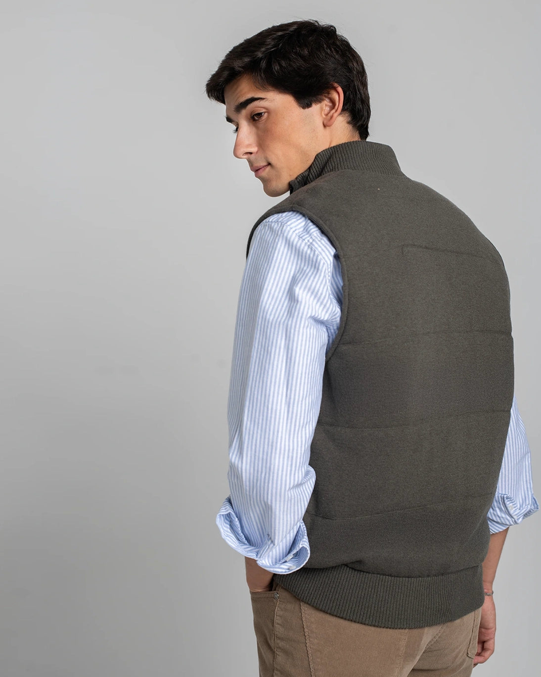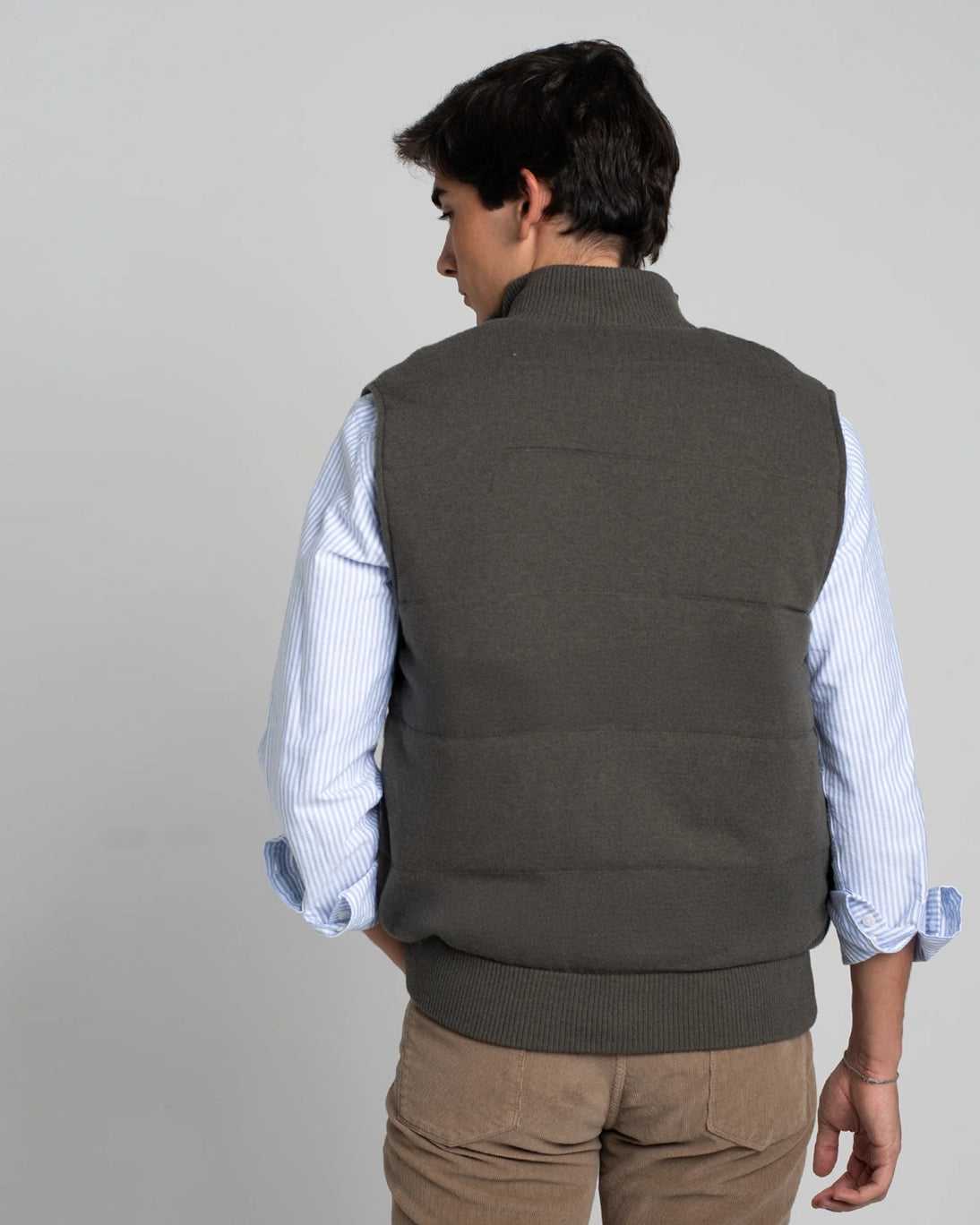 Chaleco acolchado con el exterior confeccionado en lana reciclada, con cuello chimenea y elástico en el bajo. De color verde caqui.