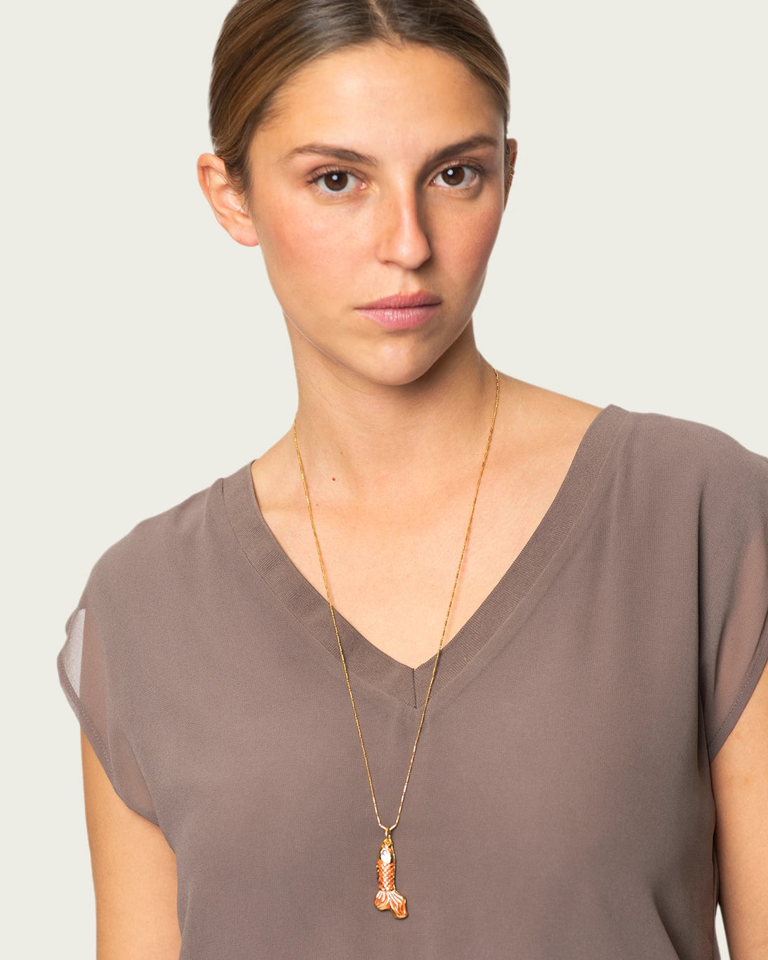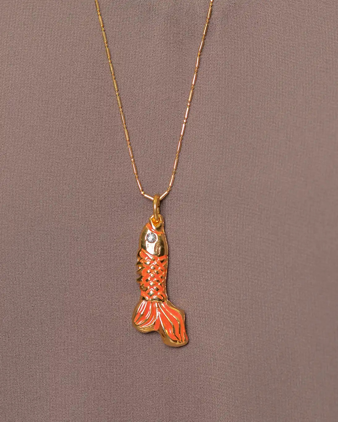 Colgante Carpa de la marca Omi Touch. Está esmaltado en dorado y coral para resaltar cada detalle. La carpa, símbolo tradicional en la cultura oriental, aporta un elemento distintivo y elegante a este collar.