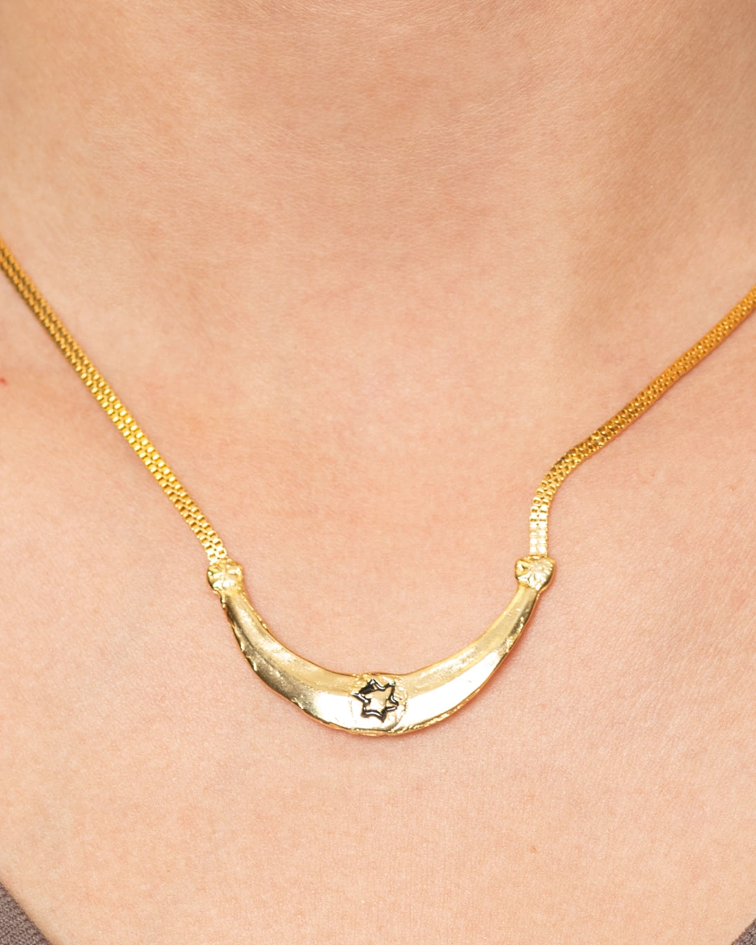 Colgante Media Luna de la marca Omi Touch. La luna, cuidadosamente detallada con una estrella en medio, cuelga de una cadena fina. Es perfecto para cualquier ocasión, ya sea una cena elegante o una reunión informal.