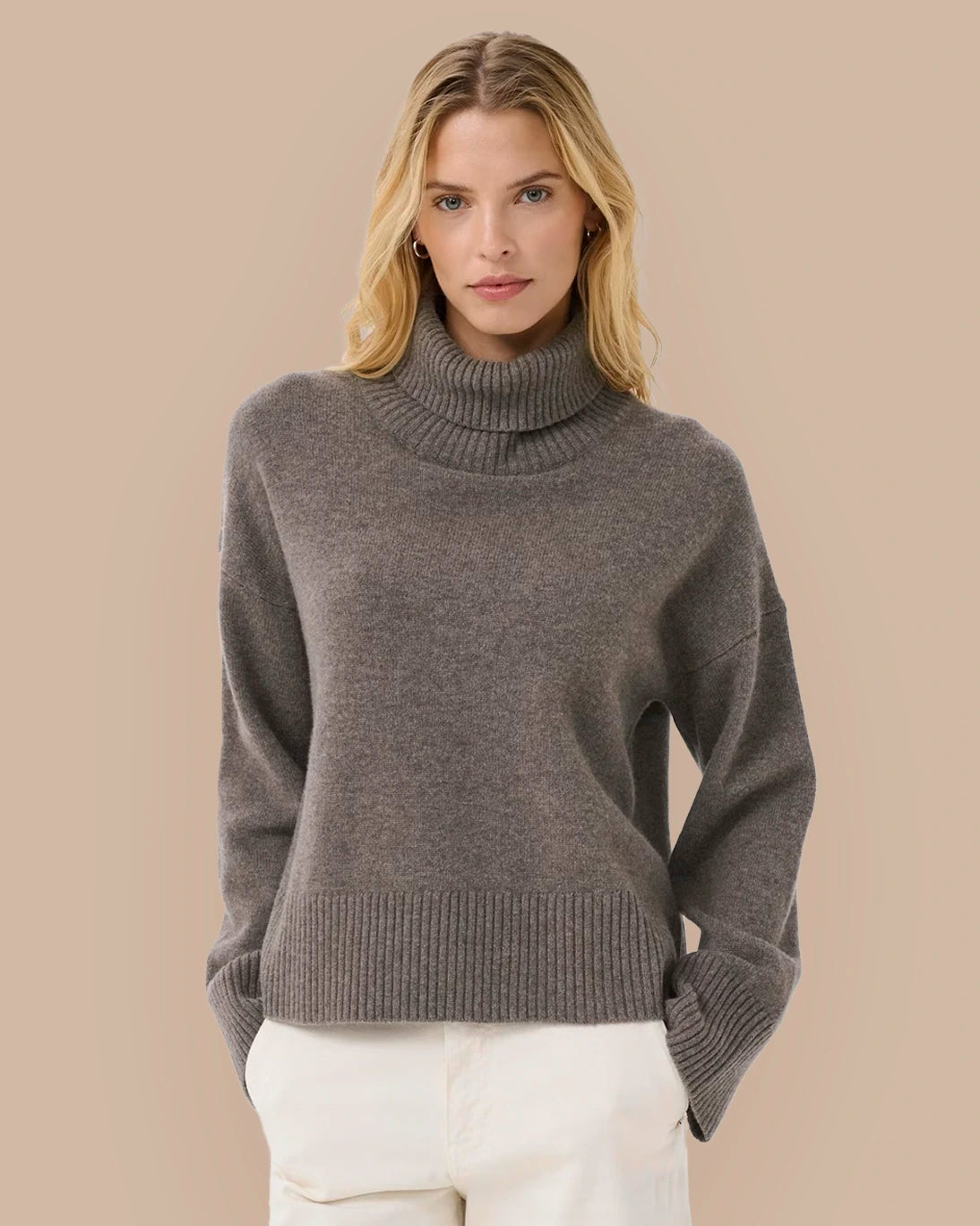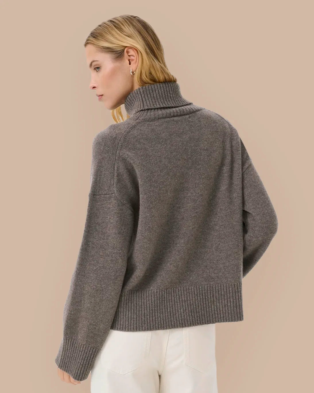 Tiene acabados de canalé ancho en las mangas y el bajo, que aportan textura y estructura al diseño. El cuello alto proporciona una protección extra frente al frío.