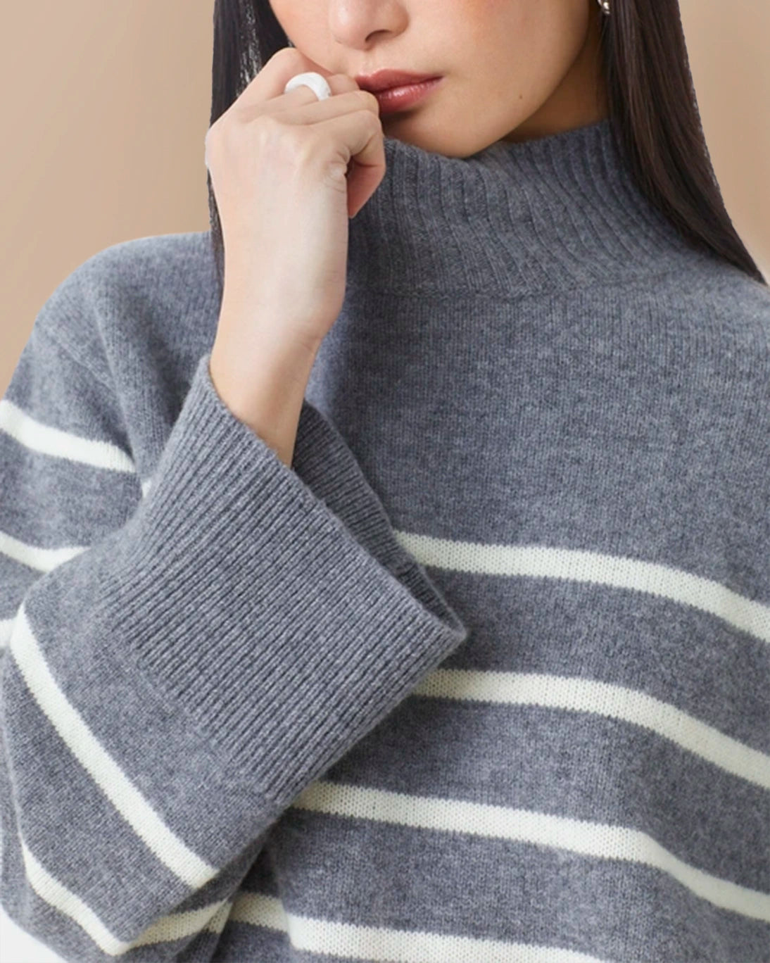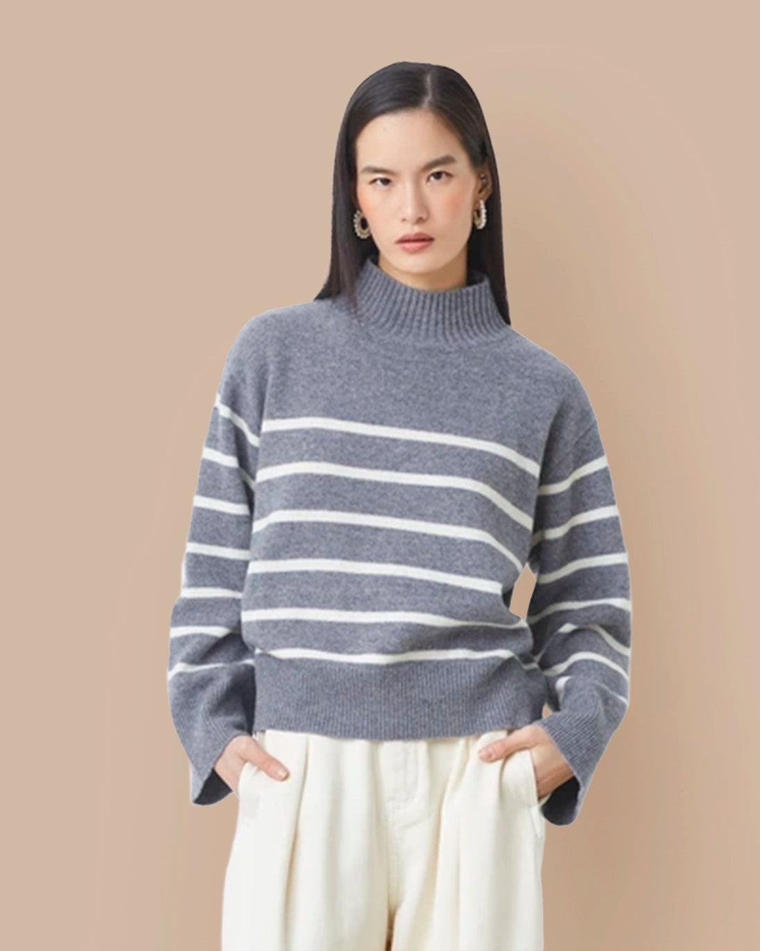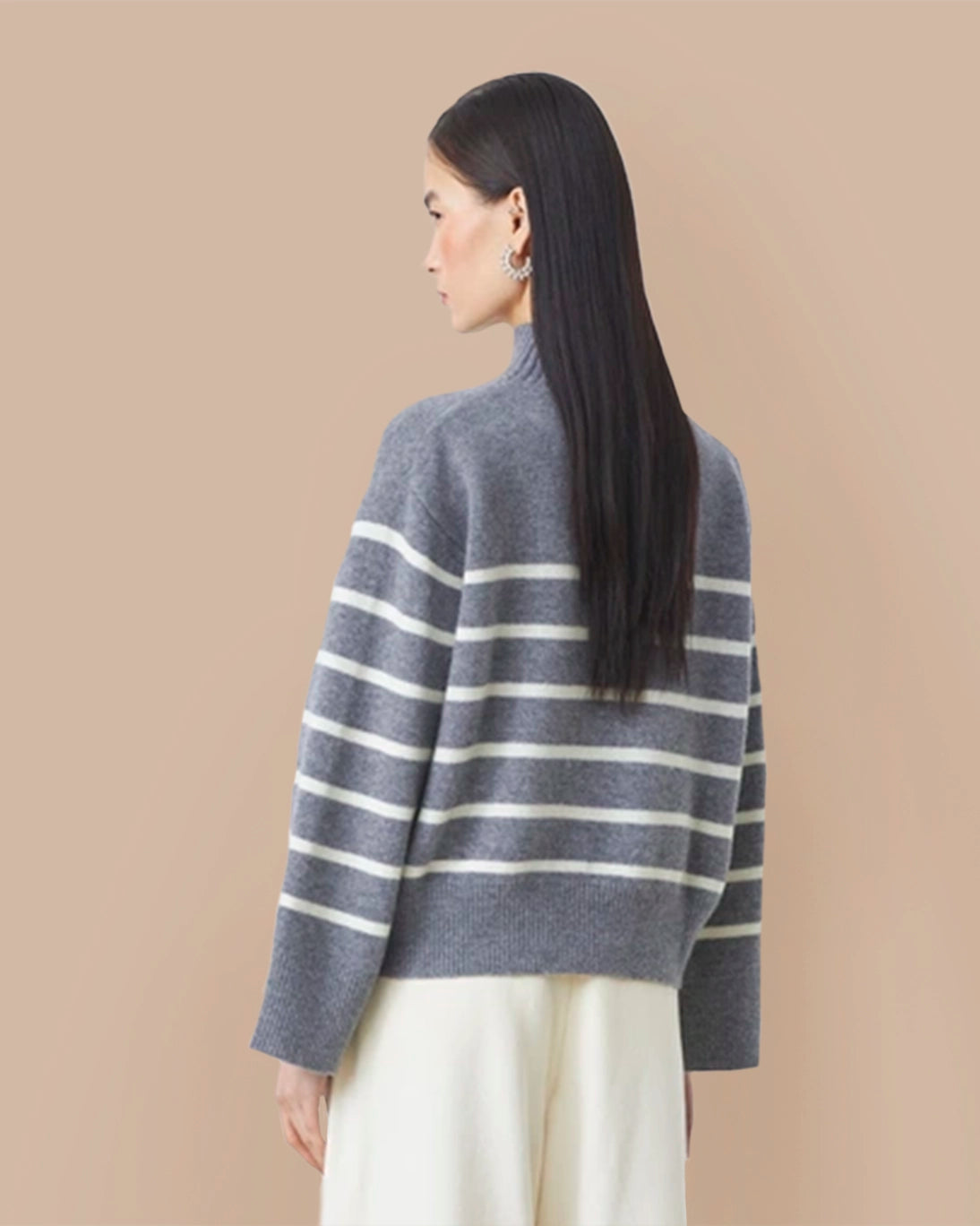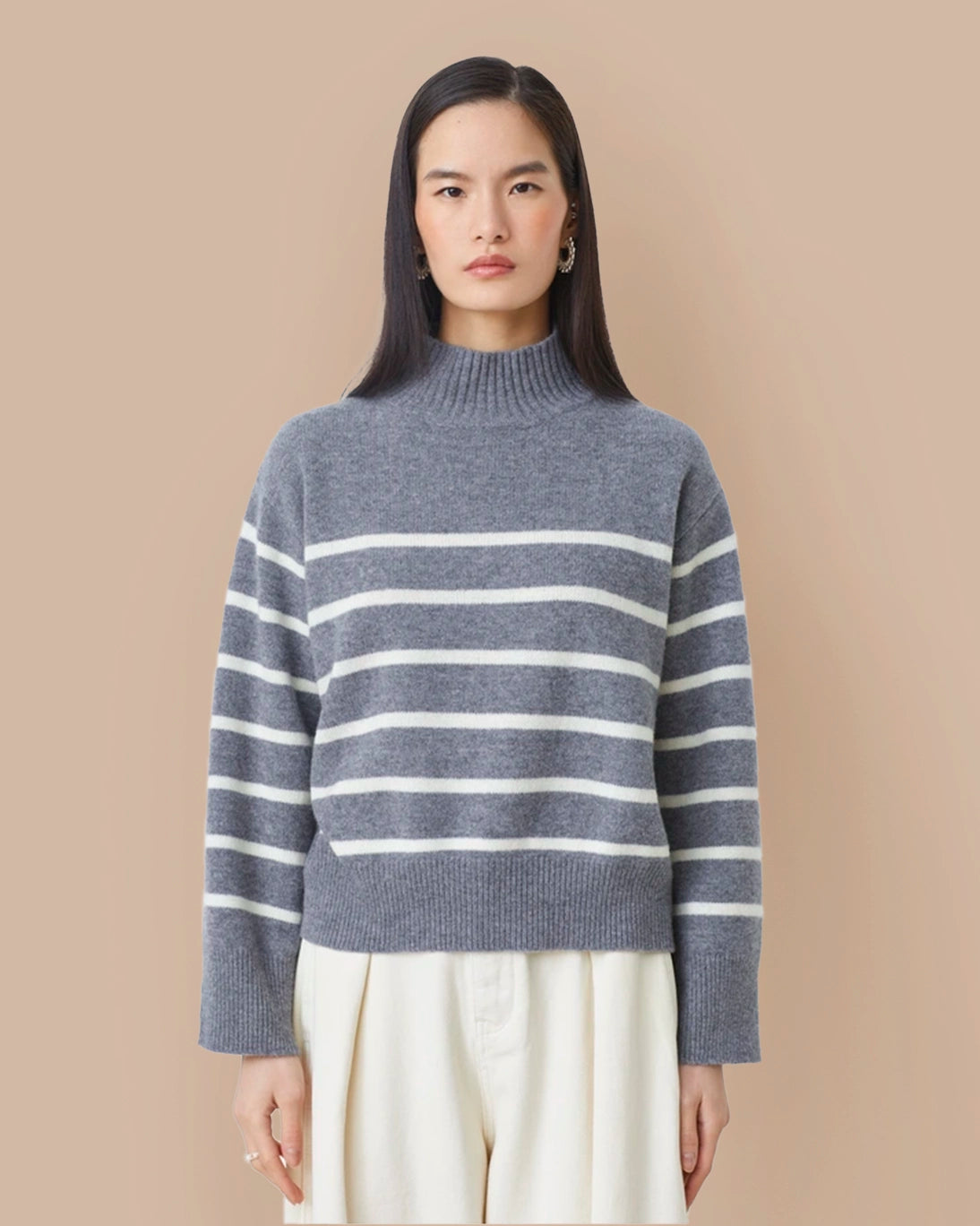 Jersey amplio con cuello chimenea de la firma Sessùn, en gris con rayas horizontales en hueso.