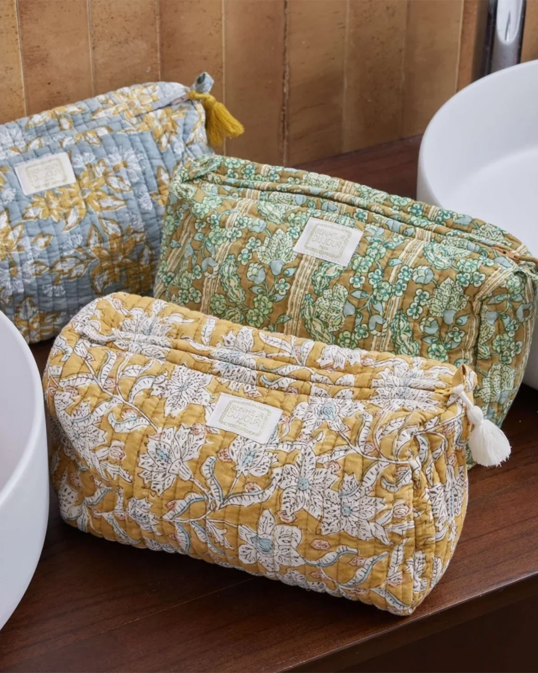 Neceser de tela guateada estampada con flores de inspiración india, con fondo amarillo y flores blancas. Tiene un gracioso pompón en el tirador.