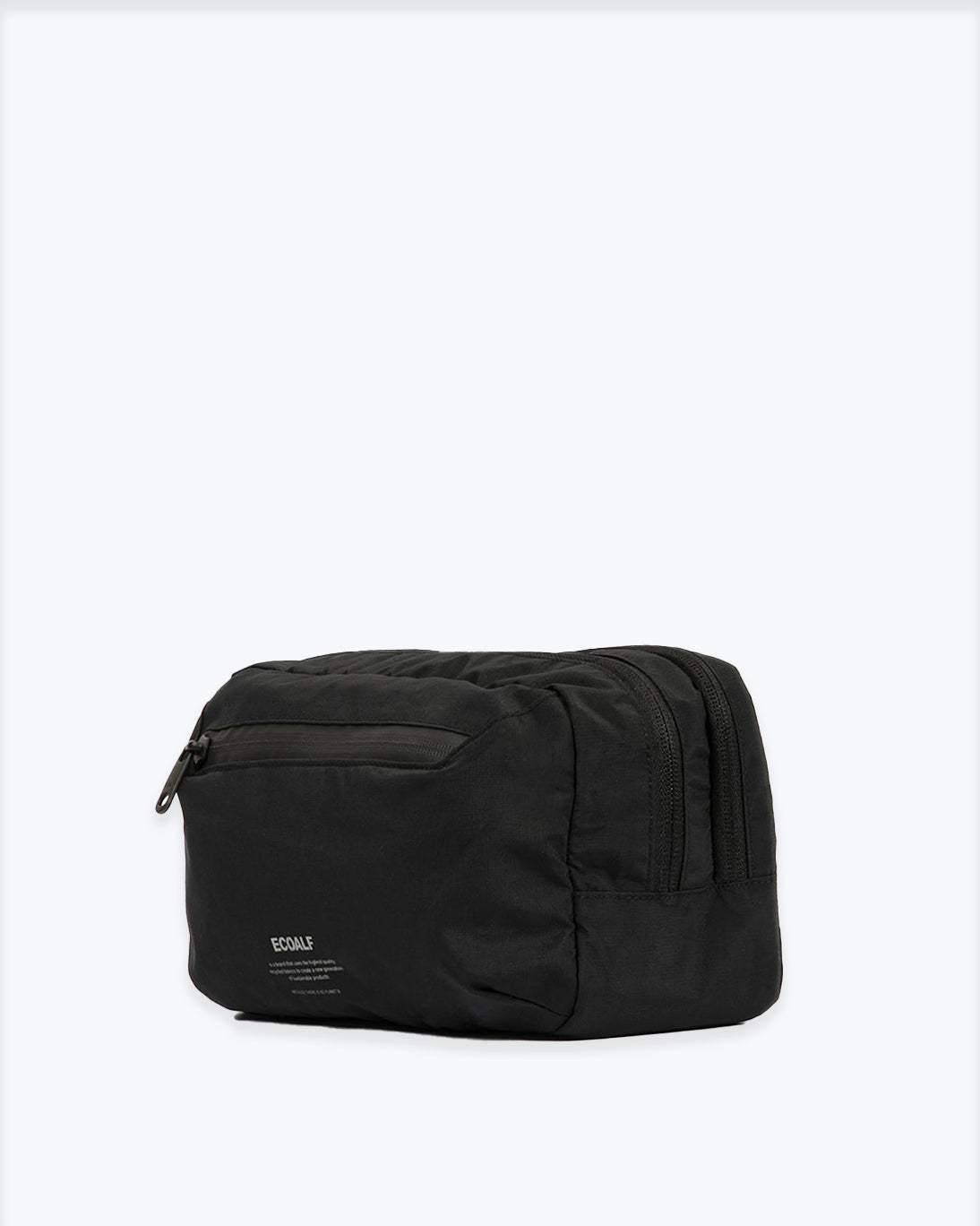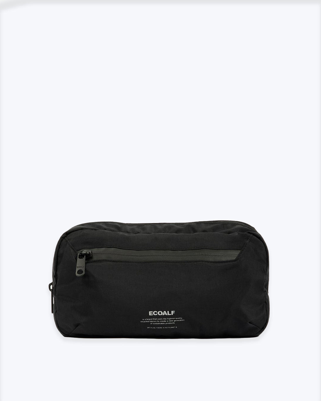 Neceser Oslo en negro de la marca Ecoalf. Su tejido impermeable y el acabado repelente al agua protegen el contenido, mientras que la cremallera de doble dirección en color negro facilita una apertura amplia y cómoda.