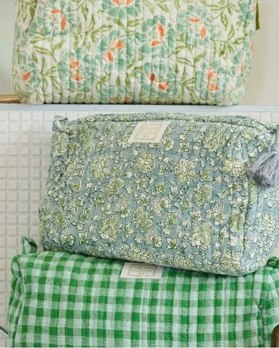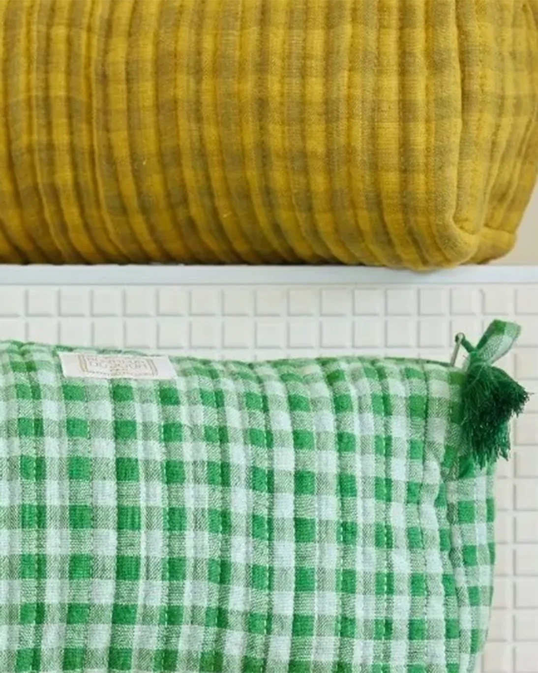 Neceser de tela de vichy guateada en tonos verdes, con pompón en el tirador.