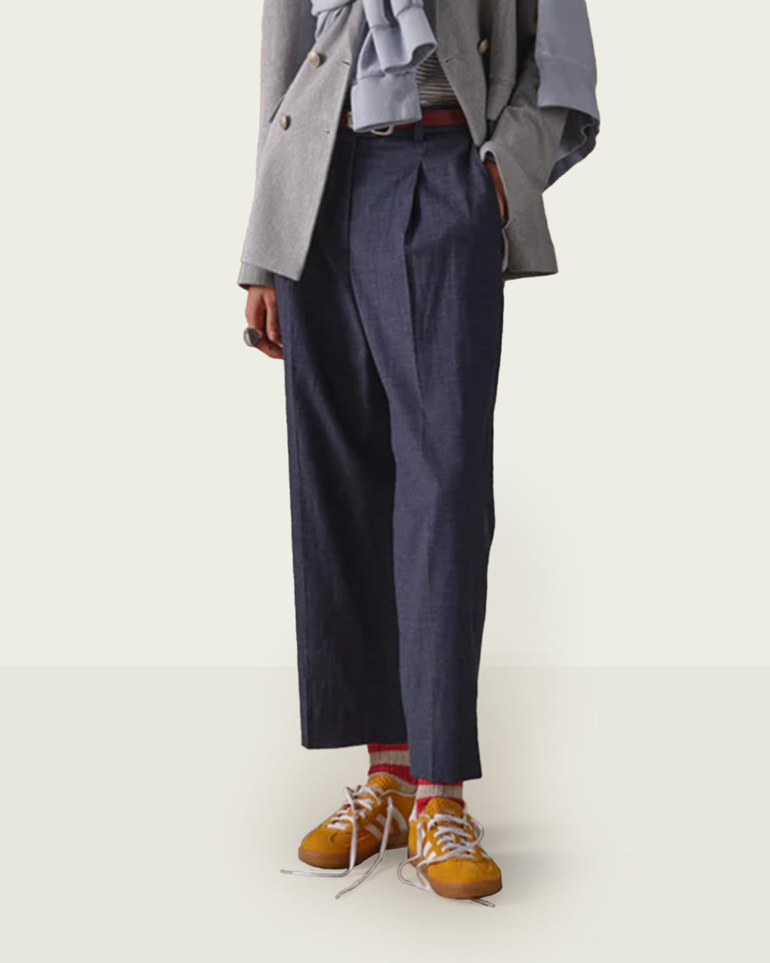 Los bolsillos laterales y el bolsillo trasero tipo ojal aportan funcionalidad sin restar sofisticación, mientras que el cierre con botón mantiene la prenda pulida y estructurada. Confeccionados en una mezcla de lino y algodón, ofrecen ligereza y transpirabilidad, además de una caída natural que acompaña el movimiento.