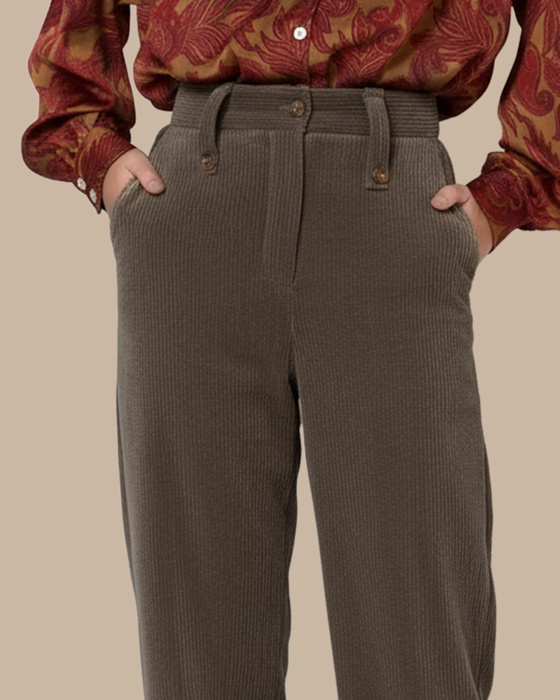 Pantalón Cuca de la marca Sophie & Lucie. El corte es ancho con bolsillos en la parte parte delantera decorados con botones. El tejido es de pana color marrón y el cierre es con botón y cremallera.
