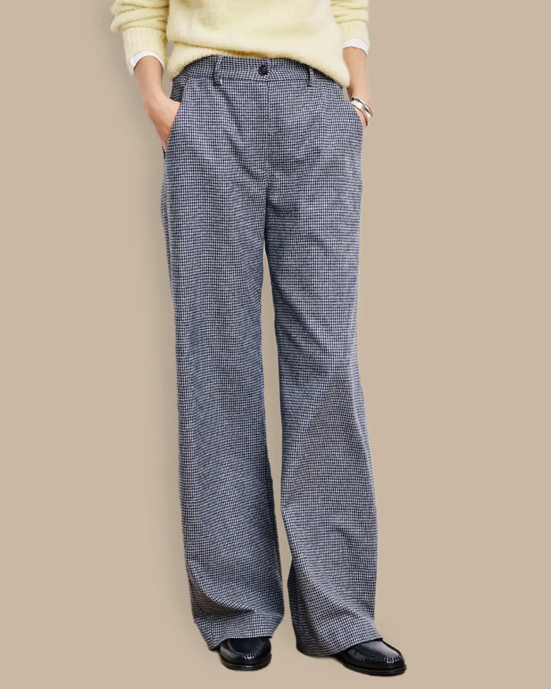 Pantalón modelo Positanon de la firma Hartford, confeccionados en franela de lana con pata de gallo azul marino y hueso.