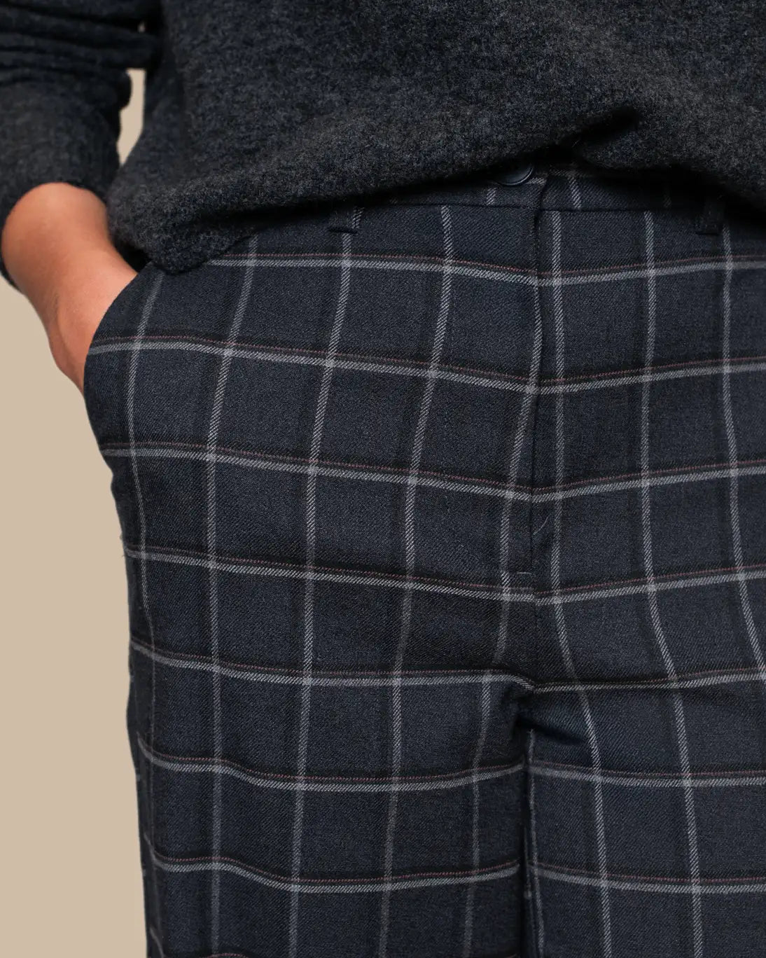 Pantalón Serena de la marca Vila. El estampado es de cuadros en diferentes tonos grises sobre un fondo azul marino. El corte es recto y ancho, con bolsillos en los laterales.