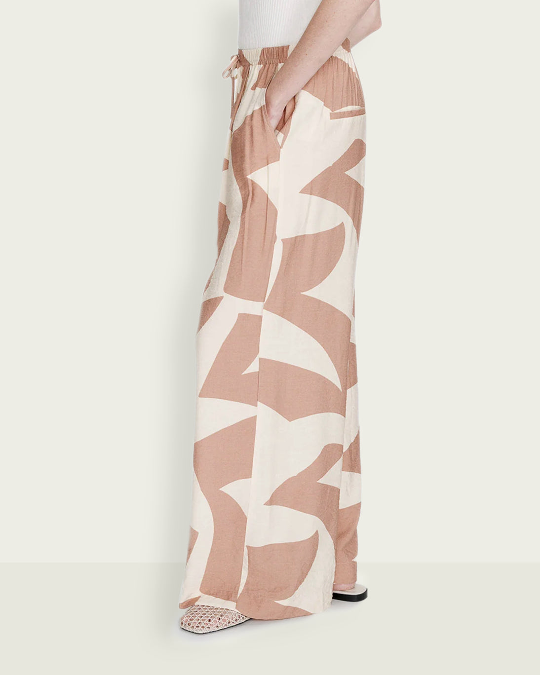 Pantalón Veni blanco y mocha de la marca Grace & Mila. El estampado geométrico bicolor aporta un contraste moderno. Su corte recto y la cintura elástica de tiro medio con cordón se adaptan cómodamente a todo tipo de siluetas.