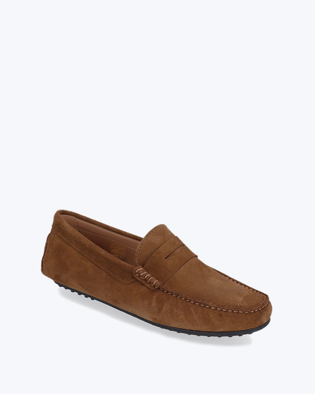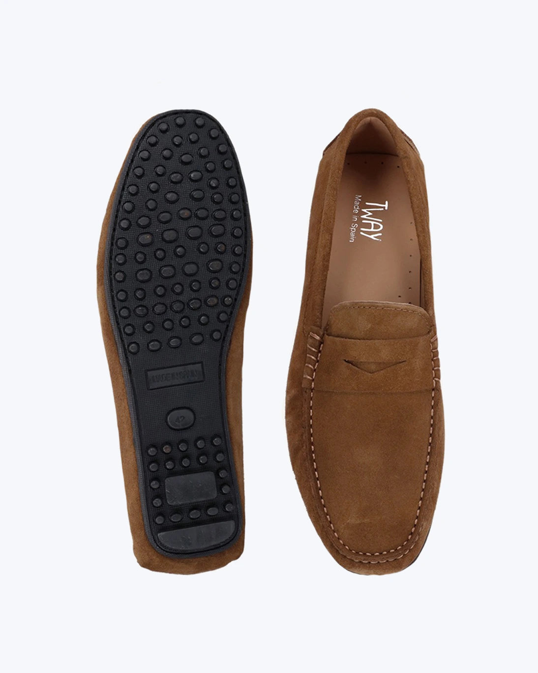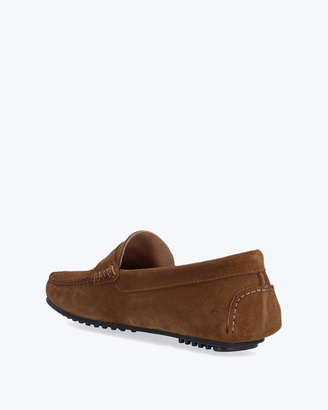Zapato mocasín de verano con antifaz, realizado en serraje color tabaco, con suela de goma.